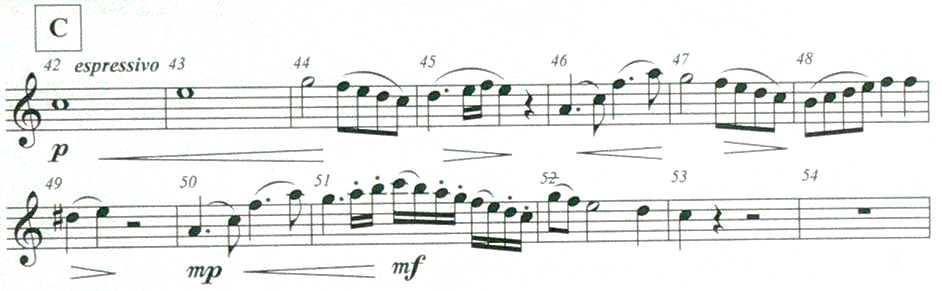 Beginne weich mit dem Hauptthema in T.43, aber mit viel Ausdruck. "Lass´ es blühen" (alles F-Seite: das offene d2, das f2 mit B1, alle es2 auf B1). Versuch´ es. Das ist sicher & leicht, inkl. der 16tel in T.45 (also der ganze Takt F-Horn mit Ausnahme des es2 = B1). T.46 beginnt mit F-Horn, geht jedoch ab dem es2 auf das B-Horn über (B1-B0). Bleibe aber auf der B-Seite für die folgenden f2-es2 (B1-B1), kehre aufs F-Horn zurück mit dem Vorteil der typischen F-Horn-Naturbindungen d2-c2 und c2-d2; dann wieder B1 für die beiden "Aufstrich" es2-Viertel vor dem Ende der Phrase mit dem etwas hervorgehobenen c#2 (F2). Beginnend mit der erreichten Lautstärke geht es mit Mut für den ersten Aufstieg weiter. Ein leichtes crescendo hilft gut. An der 2.Hälfte T.50 empfehle ich das B-Horn bis vor der halben Note d2 (F0). In T51 sollte das gehaltene f2 mit B1, die "bergab" Sechzehntel g2 & f2 und das erste Achtel in T.53 als B0 ausgeführt werden. Die Sechzehntel sind auf dem B-Horn sowieso besser. Mozart verlangte meist zwei gebundene und zwei gestossene Sechzehntel. Das bringt Sicherheit und Klarheit. Pass auf, dass der erste Ton in T.52 nicht wegläuft und dass der Abschlusston nicht rausgeplärrt wird.