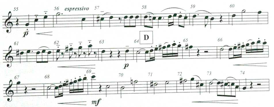 Ja, natürlich braucht man hier eine Pause. Das erste Solo ist aber noch nicht zu Ende. Komm mit drei "Aufstrich-Vierteln" und setze die Dreiviertelnote f2 schön mit T1. das folgende h schön im tenuto und die folgenden drei Achtel c2 (als d2 notiert) leicht getupft (Aufstrich) , eine leichte Betonung auf das c2. Die Sechzehntel ganz leicht auf dem F-Horn (T.58), die Endnote a1 nicht zu kurz. wenn Du Schwierigkeiten mit den leichten sechzehntel hast, also, das d2 mit dem 1.Ventil störte mich nicht. Oh, ich habe vergesse, das man den letzten Ton der Phrase in T.59 ruhig mit der Zunge anschieben sollte. T.60 beginnt auf der F-Seite, wird aber sofort auf dem B-Horn fortgesetzt, u.z. mit T1, und wieder für den ganzen T.61 aufs F-Horn zurück (cis mit 2, d mit 0). Die leicht abgesetzten Achtel sind wieder "Aufstrich" aber mit leichtem crescendo. Der Niederstreich c in T.63 muss ganz genau sitzen, ebenso der folgende c2 Auftakt: wechsle hier aber wegen der Klarheit besser zum B-Horn. T1 hilft für das g2 (ausnahmsweise). Beginne T.66 mit einem vorsichtigen crescendo. Auch hier hilft T1 für das g2, und noch ein crescendo ganz hinauf zum b2. Der Lauf gelingt besser, wenn auch hier e & f wie in den vorhergehenden Takten gebunden werden . Das Ende der Phrase, also die Folge der halben Noten, ist auf der F-Seite sehr schön auszuführen, die Bindung f2-h sehr süss, nur hinuntergleiten und mit einem leichten crescendo zum Abschluss f1. |