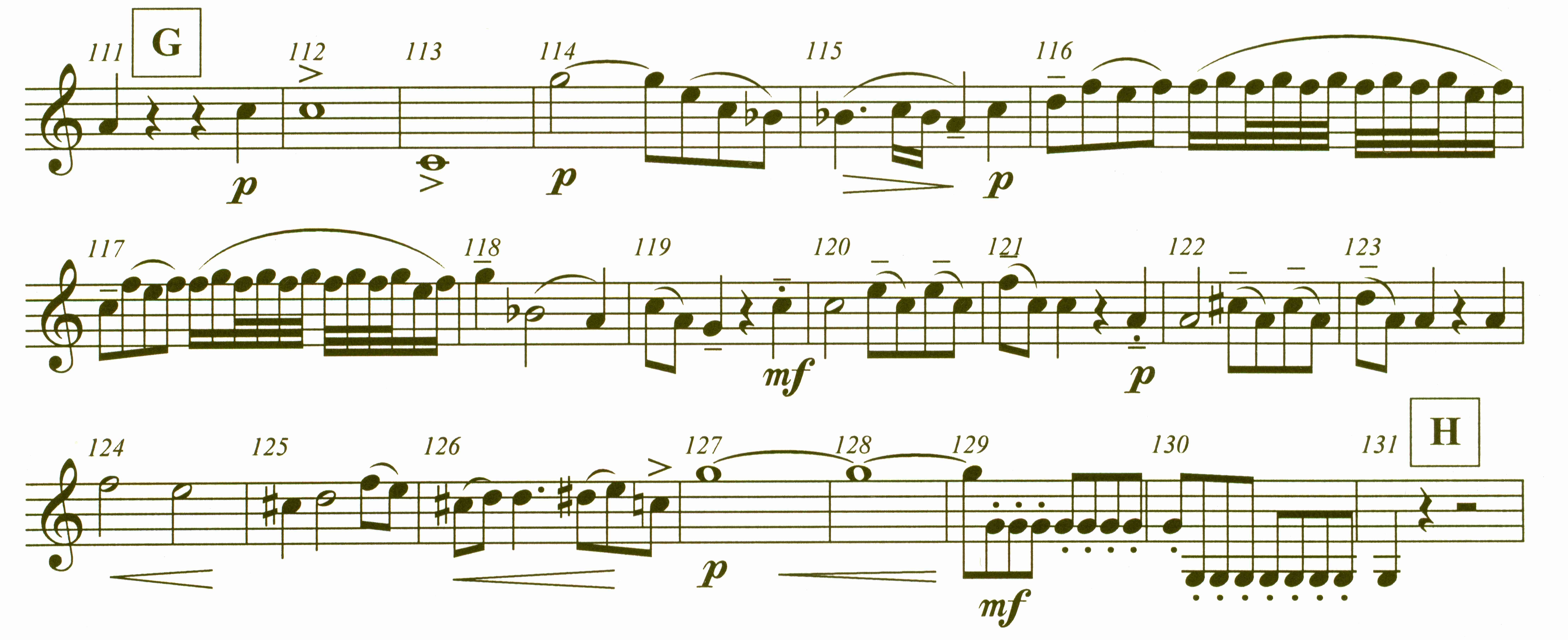 Upbeat bb1 not too short, but separated like an "up-bow" note. The long bb2 & bb1 in M.112/113 respectively come as light accentuated well separated bells, but the lower bb should be a bit shortened to have enough time to adjust the lips for the f2 (without accent & played with T1). The g1 in M.115 might be tongued but has to be held nearly the full length, but leaving time for an extreme fast breath before entering again with the bb1. The downbeat c2 is not short but well separated from the following eb2. These trills are different than before as they might beginn with an introductory f2 grace note. Why do they require that ? Here the preceding note is exactly the same as the main note of the trill. The ending sixteenth should be carefully in rhythm as they are not to be seen as "abschlag" notes. The f2 in M.118 has to be well set in "tenuto". Execute the upbeat bb1 in M.119 as a violin up bow, well separated from the following down beat. F-horn slurs d2 (F0) - bb1 (F1), and the last slur eb2-bb1 (T1-T1) give a very soft effect, specially if the eb2 is well held, but not shifting the rhythm. Remember, that the following sequence must be played softer (M.122/123). It was hand muted during the Mozart days, when they had the hand horn only (hand horn in E-flat). The emphasis was given to the c2 1/8th (M.123) by open the right hand. We, today, we can do this with some more airflow. As a contrast, there is a crescendo starting with the upbeat to M.124. Here T1 would be appropriate for the eb2 as were the F0 for the following half note d2. If you need to breath, do it before the three 1/8th note group in M.126, the last bb1 tongued, so to catch the f2 (T1) well. Stay on the f2 without decrescendo, shorten the end of the long note f2 to enter with the f1 eights in a proper & safe way, nicely staccato these eights & the succeeding eights one octave lower, but take care that this staccato does not come too hard, just dotting the notes. The lower f eights could be played a bit stronger as they are weaker anyway. |