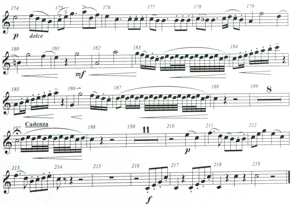 Gib acht, nicht alle Munition zu früh zu verfeuern, bewahre etwas für den letzten Lauf und den Triller. Der Einsatz in T174 sehr weich, das d2 als offenen F-Horn-Ton. Singe diese Melodie. Hier verlangt das es2 wieder T1 (stimmt sehr gut und ist sehr praktisch). Die Tonfolge b1-d2-f2 ist auf der F-Seite viel leichter; nimm das erste Ventil, ausser für das d2. Achte darauf, dass die wieder-holten Achtel in T.176/77 nicht laufen, besonders, wenn Du die punktierten Viertel abkürzt. Die Sechzehntel in T.178 rhythmisch sorgfältig (d2 = F0), das a1 im gleichen Takt zwecks Klarheit leicht angestossen. Oh, ich habe vergessen, den "Atempunkt" zu erwähnen: erst anstelle des Punktes der punktierten ¼ in T177, dann vor dem Auftakt zu T180. Erhöhe die Lautstärke während der Takte 179/80 etwas, und nochmals schrittweise bis zum b2. Setze das f2 in T181 mit T1, das g1 mit F0, das g2 mit T0 und das f2 wieder mit T1, dann die vier Sechzehntel (das es2 mit T1, die anderen drei auf der F-Seite) und erreiche den Triller c2 auf der F-Seite für einen wunderschönen Abschlusstriller, beginnend mit c, baue ihn aber schnell auf, da nur eine halbe Note Zeit dafür bleibt. Ausserdem braucht man Platz für den Abschlag. Der Triller braucht keinen einleitenden Vorschlag, da die Hauptnote bereits im Verlauf vorher mit dem b1 unmittelbar vor dem Triller unterschritten wurde. Jene vier Sechzehntel sind in der entsprechenden zwei-gebunden-zwei-gestossen Manier, auszuführen. Der volle Oktavenlauf T.184 ist ziemlich trickig, da Du schon ziemlich ausgepumpt ankommst. Die Schuld ist Dir selbst zuzuschreiben, da Du schon Deine Munition zu früh verschossen hast. Ich habe gewarnt. Damit der Lauf ganz klar und ohne Schwierigkeit kommt, nimmt man ihn ganz auf der B-Seite, alles staccato aber leicht mit leichtem crescendo, und wieder in der ursprünglichen Lautstärke mit dem zweiten Lauf in T.185. Vergiss nicht, schön auf dem obersten Ton "stehen zu bleiben". Und weiter mit dem Oktavsprung f1-f2, den man auf zwei Arten ausführen kann: 1) setze das untere f1 fest hin (F1), verkürze es etwas und komm mit dem oberen f2 auf T1 mit leichtem Akzent gut an, oder 2) binde in typischer Hornmanier hinauf. Die abwärtsführenden Sechzehntel in bewährter Weise wie in T.183, beachte aber den unterschiedlichen Triller. Hier gibt es mehr Zeit, einen schönen Lippentriller aufzubauen, verdoppele aber das Tempo Schlag für Schlag, lasse aber genug Raum für den Abschlag. Es gibt wieder keine einleitende Vorschlagsnote nach den gleichen Regeln wie den anderen c2-d2 Trillern. |