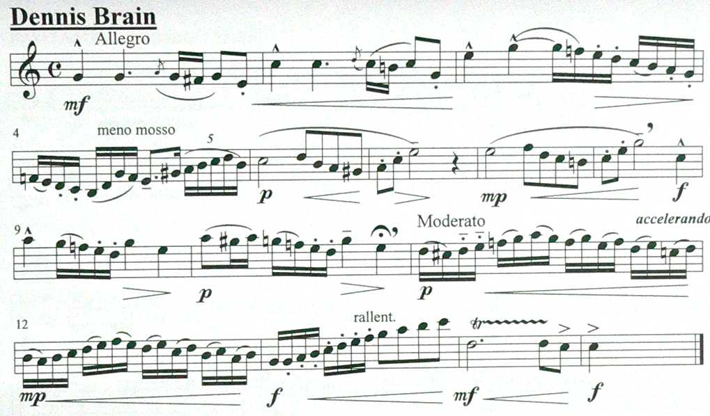Packe die Cadenza nicht mit Dingen, die Du dann doch nicht meistern kannst. Spiele kein Material, das nicht aus diesem Satz stammt, ausser Variationen oder Verzierungen. Eine kürzere Cadenza ist weit besser als eine überlange. Sehr hohe Töne rauf bis zu f3 sollte nur ein Virtuose verwenden, der sicher ist, dass er es in 99% aller Versuche schafft; es würde mich aber keineswegs beeindrucken. Solidität und der Wille, dem Genius Mozart zu dienen, das sicher besser annehmbar. Die Cadenza ist von Dennis Brain. Spiele sie bitte in gleicher fliessender Manier wie Dennis Brain und baue keine zusätzlichen (zerstörenden) Haltepunke ein. |