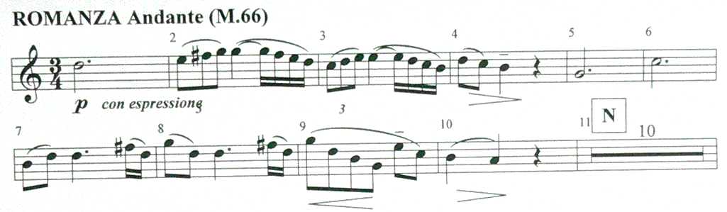 This ROMANZA Andante should stay in the 72-76 range (beats per minute), so the lower end of the Andante metronome. One can give all his or her feelings into it, but not in exhibitionistic manner, better with some distance. One should take advantage of the natural harmonics here. So only the first digit will be involved, perhaps the thumb also, using it together with the first for the f2. There must be a clear distinction between the triplet & the sixteenth sequence, not this often heard misch-masch. Make the long notes MM.5 & 6 become "life" & play the slurs in MM.7 - 9 very sweet, keeping enough time to do the sixteenths MM.8 - 9 in their full length. All six eight notes M.9 should be connected by one legato bow but the fifth note (d2) in M.9 might be tongued, but it would be ideal to connect it with the preceding f1, thus allowing the typical horn legato, which is easy on the F-horn as it involves the lucid open d1 again. The crescendo in M.9 might be extended for the full measure, leaving the decrescendo for the M.10. |