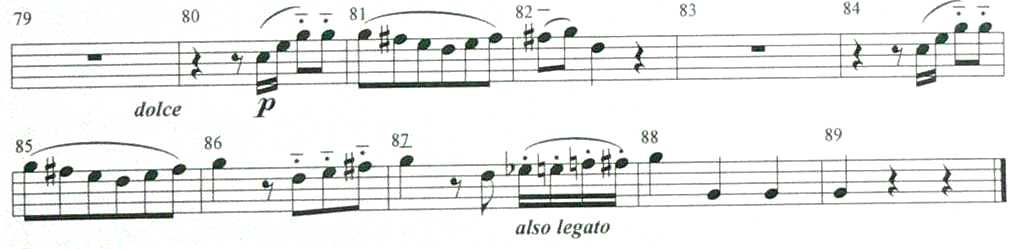 Für die nachfolgenden Takte 68-78 braucht nichts erklärt zu werden, da es eine Note-für-Note Wiederholung ist. Ein wohlüberlegter Wechsel zum B-Horn ab T.80 bis Schluss nur für die f2 (T1) - gewusst warum ! - zusammen mit den Naturtönen des F-Horns könnte eine hübsche, fliessende Hornlinie schaffen. Etwas tenuto auf das erste Achtel e2 (T82) und auf die beiden f2-Achtel (aber abgehoben, T.84) und die drei Auftaktachtel in T.86 ebgehoben, dazu schön artikulierte Sechzehntel in T.87 beschliessen den Satz: Wenn nun noch die drei letzten f1-Viertel nicht zu kurz und im piano wären, bliebe die Spannung für das quasi sofort folgende Allegro vivace. |