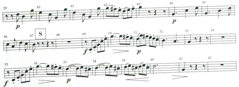 Nun kommt der erste Trickpunkt. Achte genau darauf, den 6/8 Charakter zu wahren und verändere ihn nicht zu punktierte Achtel plus Sechzehntel, wie so oft zu hören. Das Daumenventil hilft bestimmt wieder beim Sprung zum f2. Über die Takte 43-46 braucht man nichts extra zu sagen. Takt 48 sollte man mit T1 beginnen, aber nur diesen Ton, da er mit dem B-Horn ganz klar anspricht. Sofortige Rückkehr auf die F-Seite würde bewirken, dass T1 für das obere f2 als grosse Hilfe empfunden würde. Plärre aber nicht im forte und kehre in T.50/51 wieder zum schönen piano zurück. Eine hübsche Aufwärtsbindung c2-f2 wäre fein, um anschliessend die folgenden Achtel-Scala "hinunter zu hüpfen", mit den punktierten Viertel, hübsch voneinander getrennt. Die nächste Phrase ist eigentlich nur eine Wiederholung, endet nur in der dreimaligen Achtelfolge c2-d2-h1. wenn Du hier ausschliesslich das F-Horn nutzt, kannst Du dich der Schönheit des offenen d2 bedienen. Drücke nicht auf das Tempo, da die Phrase rhythmisch sowieso im dritten Takt verkürzt wird. Nun sehr schnell umblättern. Es wäre geschickter, die nächsten Takte (62-75) oben auf der Seite einzutragen (wenn man nicht auswendig spielt) , als durch langsames Umblättern aus der Bahn geworfen zu werden. |