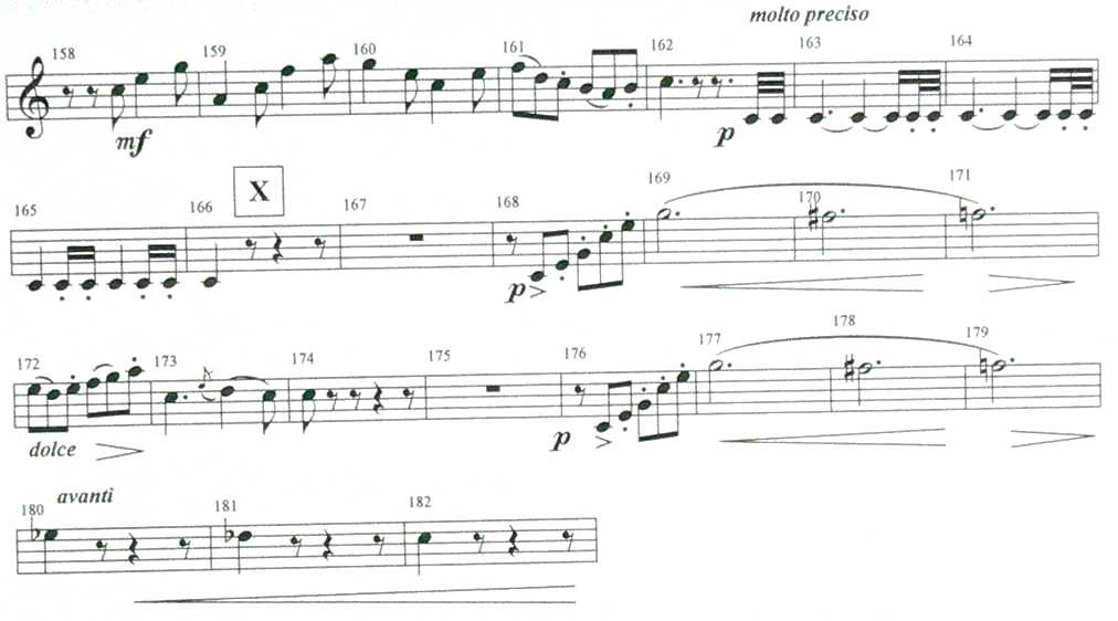 M.157 is a spot where most interprets get trouble with the orchestra, as the coordination can become problematically, if the soloist does not keep the rhythm. If you change well back & forth with thumb valve here, you might realize, that only the first valve, the strongest & quickest of all valves besides the thumb valve, will be involved. The low bb 1/32th-notes in the upbeats should be executed as they are, but for better audibility on the T1. Realize that the last sequence, M. 164 is different. Here the short notes are sixteenths. Sounds like a diesel. Ha, ha ! Now as we have reached the end of the concerto nearly, there is not much to say further. Nice tonguing the third & the sixth note in M.171 would contribute to clarity, as slurred d2 (F0)-c2 (F0) and eb2 (T1) - f2 (T0 !!!!) but g2 (T0) would do also. Push the tempo something forward within MM.179-181, as going for a cadenza & ad a short few second arpeggio culminating in a high f3 or in a (half) thundering forte a1 (be careful, please, as it is still Mozart !) before continuing with the entrance phrase. But do this little cadenza, if you like it only. |