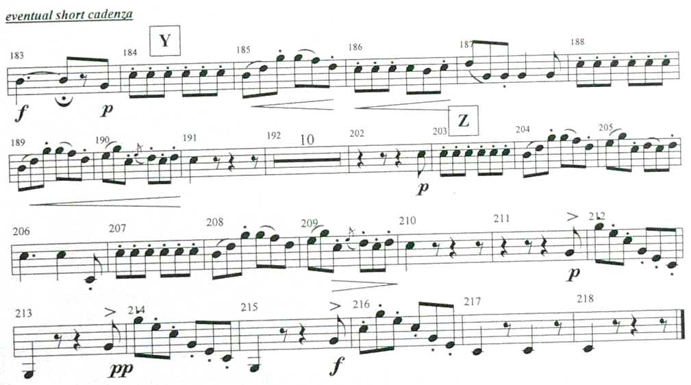 Die Wiederholung des Eingangsthemas ist im piano. Mache ein leichtes crescendo als Übergang ins tutti. Dann kommt das Thema nochmals, bleibt aber im piano mit einem überraschenden Oktavsprung b-b1 (das untere b kommt mit T1 besser !). Etwas ausgepumpt kommst Du nun in den Hafen mit noch zwei kleinen Hürden: die piano & pianissimo Sprünge f1-f2. Mach stattdessen mezzoforte und piano. Das bringt den gleichen Kontrast. Beachte F1-T1 für den Oktavsprung f1-f2. Das funktioniert supersicher. Der schwache Ton ist das b im hinunterführenden arpeggio. Auch hier und nur für den einen Ton hilft der Daumenhebel. Da gibt es auch keine Verwirrung, da für beide Hornseiten der gleiche Griff gilt. So, jetzt kommt die letzte Phrase. Beachte bitte, dass alle Töne in gleicher Stärke kommen. Tiefere Töne sind natürlich besser zu hören, wenn sie etwas stärker gespielt werden. Das ist alles. |
