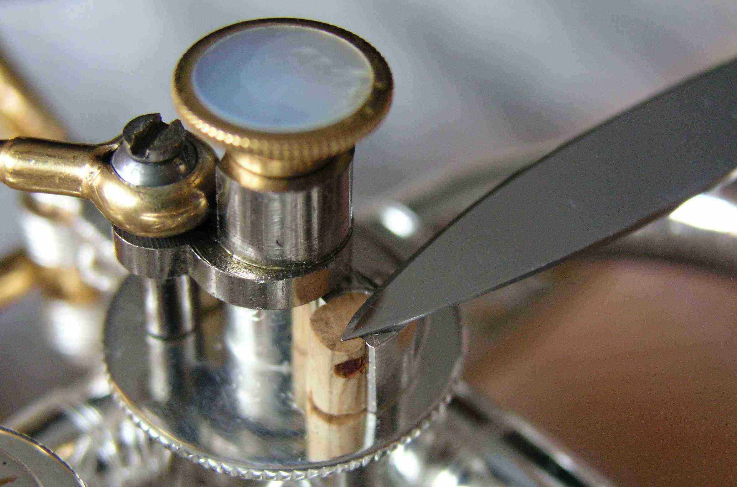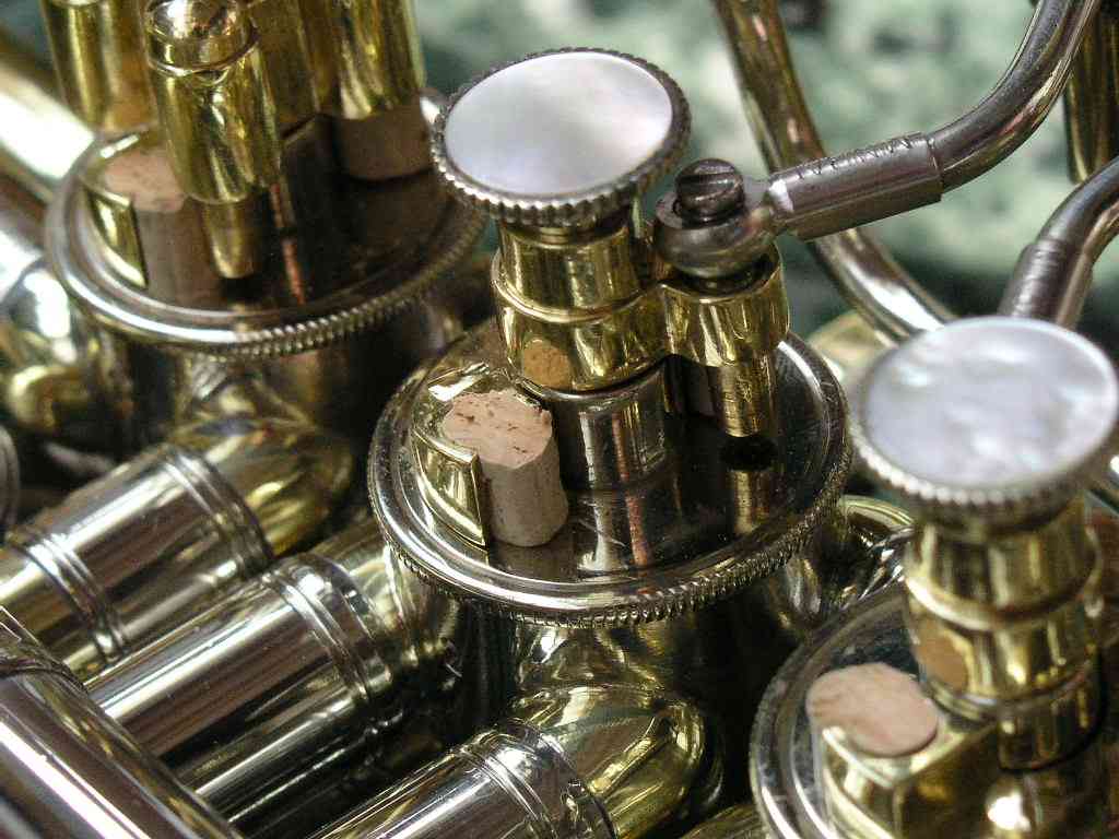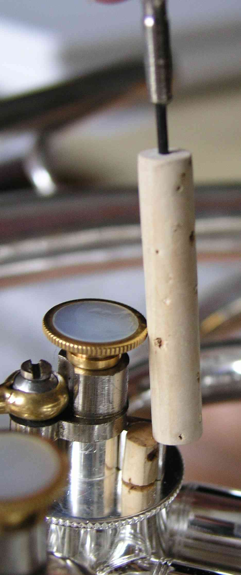 All you need for the cork change at the rotary valves can be seen on these pictures: a razor sharp knife, perhaps a surgeon knife, the thin cork barrel (6 mms thick), a thicker nail, a small screw driver, perhaps a wooden or plastic hammer, a piece of cloth or a small towel, a small punch, - much needed: patience (!) First remove the old cork using the small screw driver. Place the cork inside the small towel, roll & hammer it to oval shape carefully. Next: squeeze the cork on his place by vertical action. If the cork piece is quite short allready, or if you perform this on the change valve, pick the cork with the nail & place it vertically. Third cut the cork with the very sharp knife or using one half of a razor blade.
