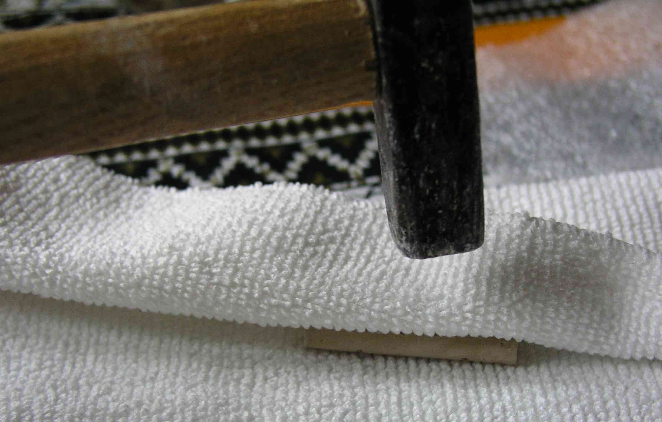 Alle Werkzeuge sind abgebildet: Skalpell oder halbe Rasierklinge, Kork-stange (6 mm), ein dickerer Nagel oder ähnlich spitzer Gegenstand, Holz- oder Plastikhammer, ein Stück Tuch, ein Durchschlag oder anderes gerades Stück Metall oder Hartholz, - wichtig: viel Geduld.