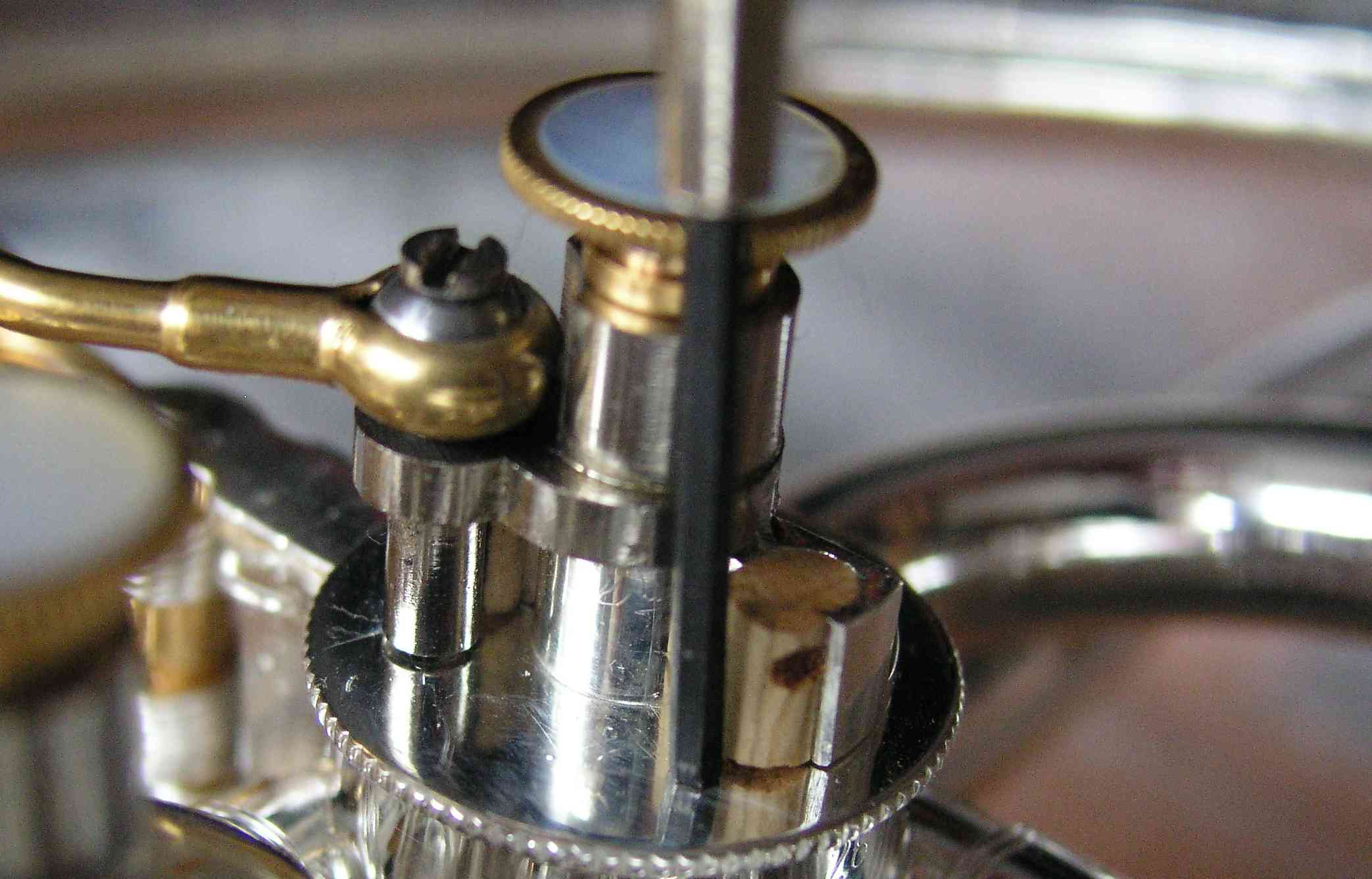 Nach Abschrauben des Ventildeckels auf dem inneren Deckel die Überein-stimmung der Markierungen prüfen und eventuell mit dem Durchschlag den Sitz des Anschlagkorks korrigieren. Ventildeckel wieder zuschrauben. |