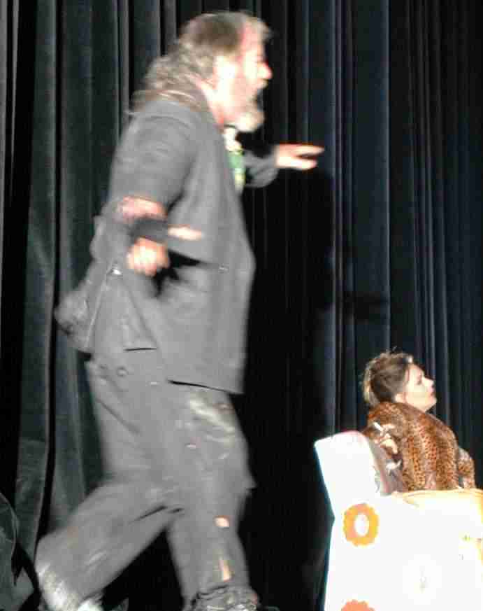 It opens with Wotan suffering a nightmare. Then Erda, his former love, appears wearing a leopard jacket, smoking a cigarette & sitting down on a couch. Funny, all women have to act as prostitutes. They discuss their past on the couch, but she leaves her old lover (who had raped her) alone after while. Lonely Wotan suffers more when Waldvoeglein stomps over him on the couch & Siegfried (his grandson) enters & starts discussing with him about the access to the fire surrounded rock where Bruennhilde is bound to by Wotan. Siegfried finally cuts in half Wotans powerless law spear by using his "renewed" power sword Notung. Then he crosses the fire barrier.