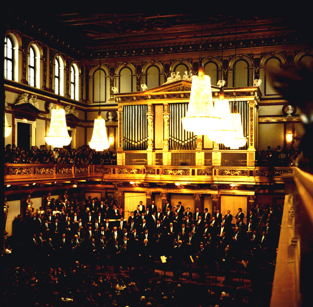 Philharmonische Horngruppe beim letzten Konzert unter der Leitung von Herbert von Karajan am 23.April 1989, zweienhalb Monate vor seinem Tod: Hans Pizka am ersten Horn ( zwei Holzbläserkollegen drehen sich gerade mit freundlichen Kommentaren zu mir um , der Wagnertuba-Schallbecher in der letzten Reihe ganz oben in der Mitte zeigt direkt auf mich), der bärtige Kollege an meiner rechten Seite ist der zweite Hornist Willibald Janezic, stolzer Vater des Solohornisten Ronald Janezic, Hans Fischer spielte 4. Horn, hinter uns die Wagnertubagruppe mit Steve Hayworth aus Milwaukee (Schueler von Dale Clevenger & Roland Berger) (1.), Roland Berger (2.), Roland Horvath (3.) & Wolfgang Tomböck sen. (4.). Ich war als 1.Tubist eingesprungen und wir hatten sogar eine Satzprobe des gesamten "Blechs" mit Maestro Karajan, als Friedrich Pfeiffer (Solohorn) erkrankte und ich den Solopart übernahm. Die Aufnahme von diesem Konzert ist bei DGG erschienen. |