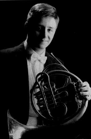 Lars Michael Stransky, solo horn with the Vienna Philharmonic since 1993, picture taken 1998 in Banff - clickon the picture for Strauss op.11 beginning (recorded with VPO DGG 453 483-2) - The Huebler Concerto for 4 horns arr. with Wind Band (CAMERATA 30CM-540 recorded.1998), he was born in Trier 1966, studied with Erich Penzel, became solo horn with the Berlin Radio Symphony 1985 for one year, solo horn with the German Opera on the Rhine (Duisburg) 1986-93. He studied Viennese Horn with Roland Berger 1991-93. His partners for the Huebler were Sebastian Mayr (*1970), member of the stage band of the Vienna State Opera since 1997, Thomas Joebstl (*1978 see below), Hannes Ramser (*1970), horn player with the N.Oe.Tonkuenstler Orchestra since 1991. Lars Michael Stransky, studierte Wiener Horn bei Roland Berger, Solohornist der Wiener Philharmoniker seit 1993 , wechselte vom Doppelhorn zum einfachen F Horn zurück. Bild aufgenommen in Banff 1988. Auf das Bild oben linke Spalte klicken für den Audio Clip vom ersten Hornkonzert von Richard Strauss, aufgenommen für DGG. Geb.1966 in Trier, studie. u.a. bei Erich Penzel, Solohornist des RIAS Berlin 1985-6, Deutsche Oper am Rhein (Duisburg) 1986-93, studierte Wiener Horn bei Roland Berger 1991-93. Seine Partner für den Huebler waren Sebastian Mayr (*1970), Mitglied des Bühnenorch. d. Wr.Staatsoper seit 1997, Thomas Joebstl (*1978 siehe unten), Hannes Ramser (*1970), Hornist im N.Oe.Tonkuenstler Orchester seit 1991 |