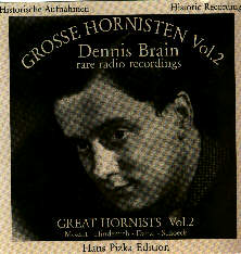 W.A.Mozart: Concerto No.2 (live 1948), Paul Hindemith: Hornsonata in F (rec.1951), Franz Danzi: Concerto in E-flat( instead of E)(live 1955), Othmar Schoeck: Concerto op.65 (rec.live 1956) - Fortunately there is one mistake in his live performance of the Mozart, conducted by Paul Hindemith. Transposing the Danzi to E-flat allows easier fingering for the horn soloist using the Bb- horn. The Schoeck is played in Dennis Brain's most mature interpretation. Hindemith's Sonata in F has been recorded in the Stuttgart Radio Studio -  Conrad Hansen (piano), Southwest-Radio-Orchestra Baden-Baden, Kurpfaelzisches Kammerorchester cond. By E.Bodart, Paul sacher Chamber Orchestra, cond. by Paul Sacher - historical recordings