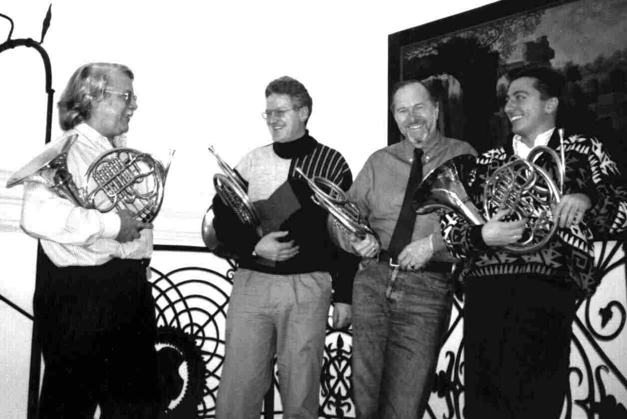 21.Nov.1996 - Schnappschuss von Michael Söllner von links:Hans Pizka (Bayerisches Staatsorchester, Staatsoper in München, 1.Horn) Erhard Zehetner (freischaffender Hornist und Direktor der Musikschule Kremsmünster, 2.Horn) Franz Söllner (Wiener Philharmoniker. Wiener Staatsoper, 3.Horn, frühzeitig wegen eines häuslichen Unfalles, bei dem ein Schneidezahn den Nerv der Unterlippe irreparabel durchtrennte, pensioniert, 3.Horn) Eduard Geroldinger (freischaffender Hornist & Direktor der Musikschule in Ried, 4.Horn and "Der zweite Streich" - "The Second Prank" - other 23 horn quartets by Erich Pizka including some arrangements of music by Franz Schubert, Anton Bruckner, Franz Abt, Friedrich von Flotow, Johannes Duerner & Eduard Hermes. |