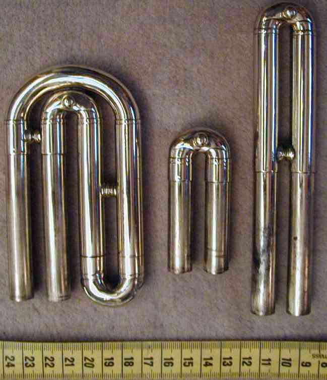 The tuning slides have the following lengths, shafts not calculated: Bb old high Munich pitch: 149 mms Bb new low Paris pitch: 257 mms A: 319 mms The shafts are of 60 mms length each |