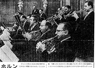 ![]() clip out from Asahi Shimbun 1956, first Japan tour of the VPO; horn player in front Josef Koller, next to him Gottfried von Freiberg. behind to him first trumpet player & general manager Helmut Wobisch (last row, second from right). Foto taken in the Golden Hall of the Vienna Musikverein.- Ausschnitt aus der Asahi Shinbun (Tokyo) von 1956, von der ersten Japanreise der Wiener Philharmoniker: vorne Josef Koller, dahinter in der Reihe Gottfried von Freiberg, hinter ihm Solotrompeter und Manager Helmut Wobisch. Das Foto ist aus dem Goldenen Saal im Musikverein in Wien |