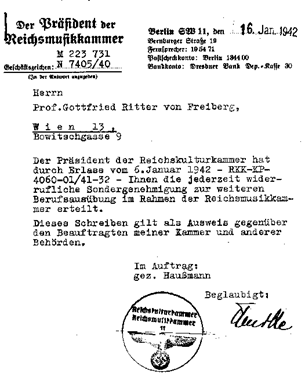 The special permission by the Reichsmusikkammer, to continue in his job with the Philharmonic. - Die Sonderarbeitserlaubnis der Reichsmusikkammer. |
