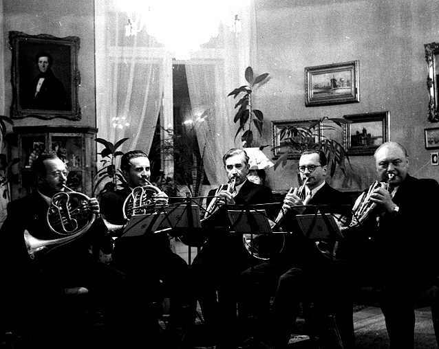 The "Blaervereinigung der Wiener Philharmoniker" in Salzburg - from left to right: Karl Oehlberger (bn), Josef Kamesch (ob), Gottfried von Freiberg (hr), Leopold Kainz (2nd hr), ? , ? , Leopold Wlach (cl - 2nd from right)), ? ;- Die Bläservereinigung der Wiener Philharmoniker (Oktett) in Salzburg; v.l.: Karl Öhlberger, Josef Kamesch, Gottfried v. Freiberg, Leopold Kainz, ?, ? , Leopold Wlach, ? . |