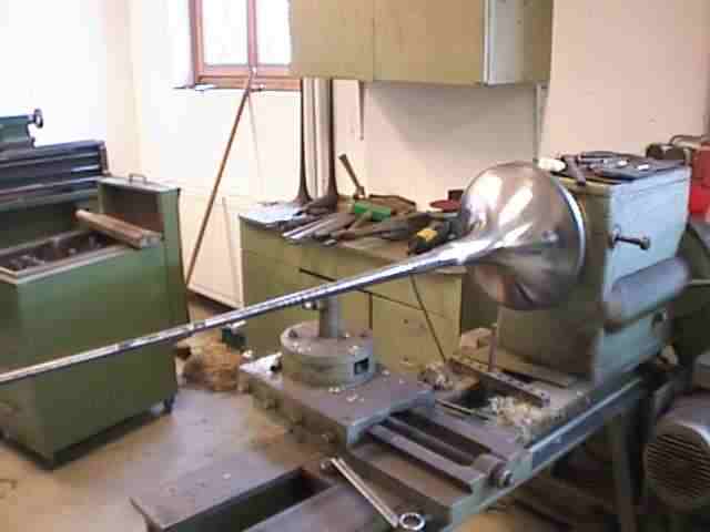 i) Ein letztes Polieren und gleichzeitiges Entfernen der Oxydschicht.(oben) j) Der lange stählerne Schallstückdorn; eine Spezialanfertigung der Firma Böhm. (links)