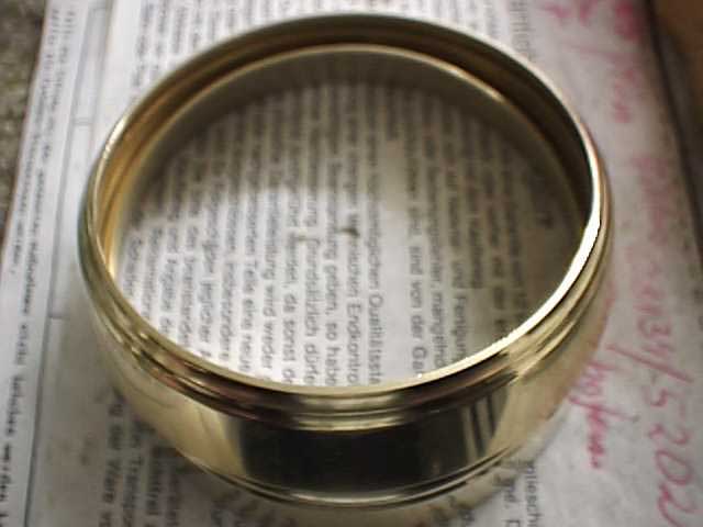 So wird der Becher gemacht: a) Der Becher wird aus Messingblech zugeschnitten, gefalzt und an der Naht verlötet. b) Detail der Naht mit den kleinen Zähnchen. Gelötet wird mit einem Speziallot. c) Der Becher wird mit einem Kunststoffhammer roh auf dem Amboß geformt. d) Anschließend wird er auf 590-600 Grad erhitzt um das Metall weicher und besser formbar zu machen. Dieser Prozeß wird mehrmals wiederholt.